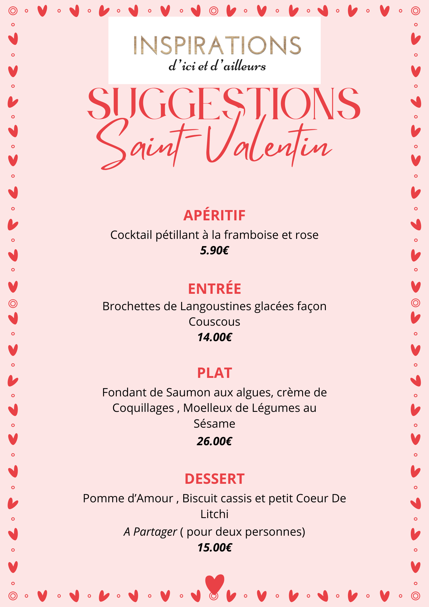 Nos Suggestions St Valentin sont disponible le vendredi soir 13 février, ainsi que le samedi , midi et soir, 14 février, en plus de notre carte traditionnelle et nos inspirations éphémères.